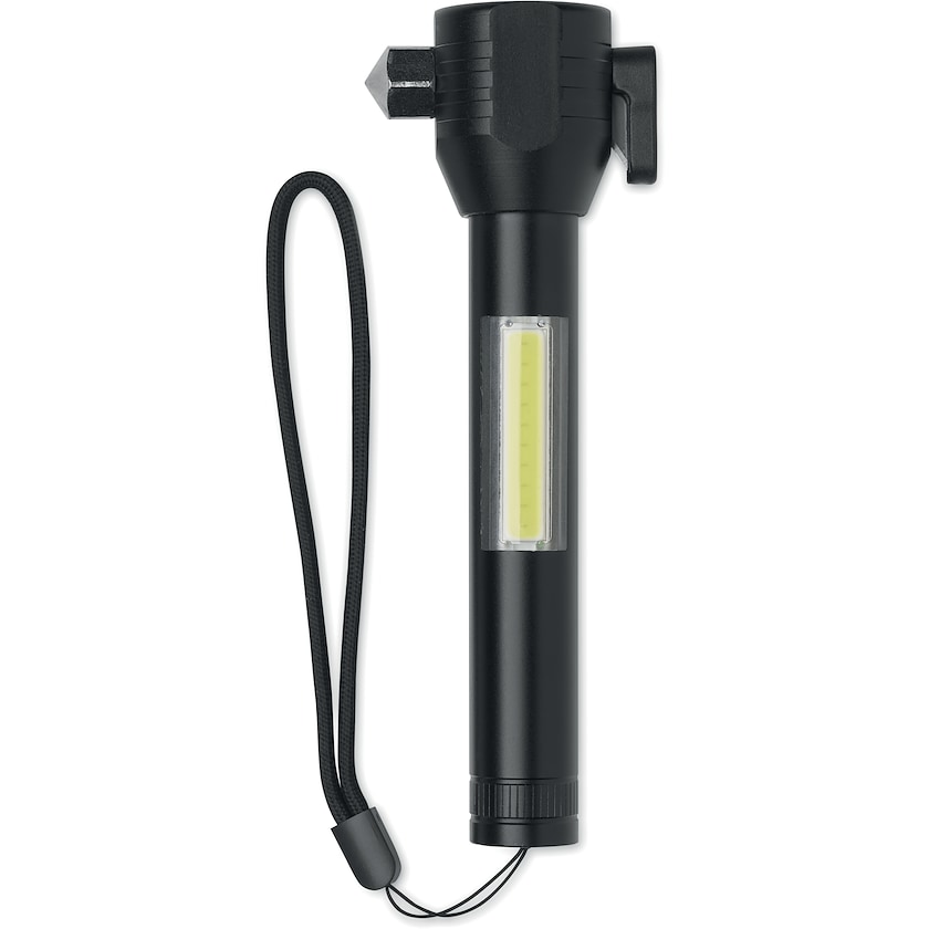 Martello d'emergenza 3 in 1 con tagliacinture e lampada COB. Il martello è dotato di fissaggio magnetico e laccetto da polso. Alimentato tramite una batteria ricaricabile incorporata.