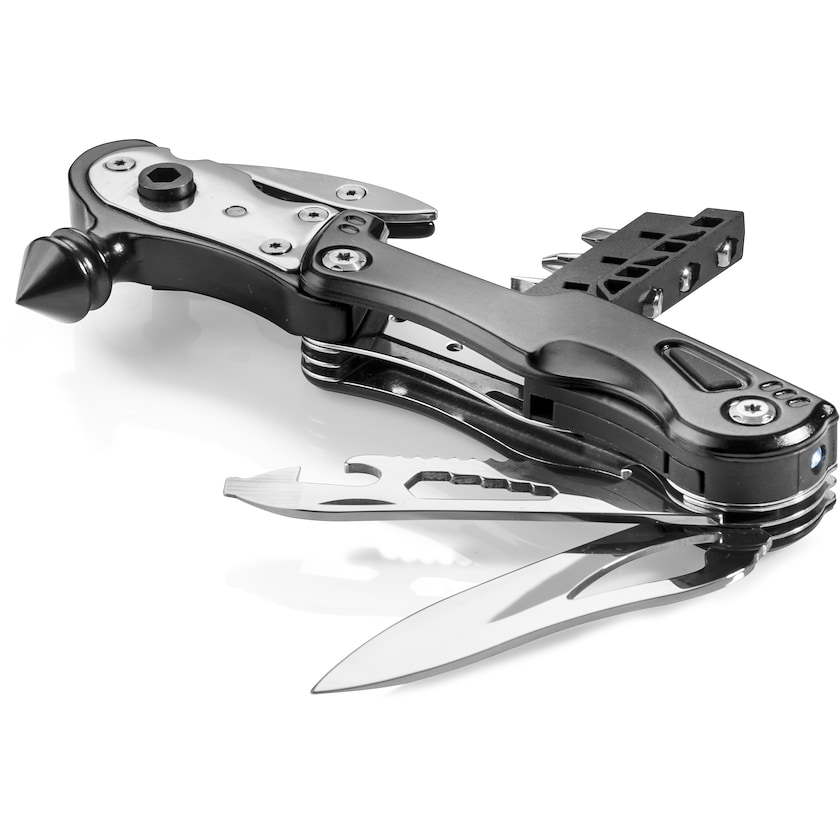 Martello di emergenza con un totale di 11 funzioni diverse. Oltre al martello di emergenza, è dotato di funzionalità come taglia cintura, torcia, coltello, set di cacciaviti a 3 bit, forbici, apribottiglie etc. Viene fornito in una elegante custodia nera. Viene personalizzato con incisione laser.