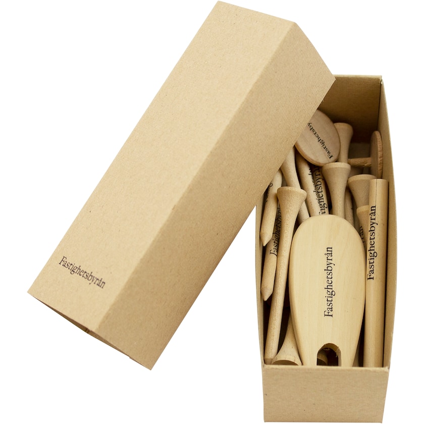 Set con vari accessori da golf. Il set contiene 20 tee in legno, 2 marcatori in legno, una matita e un alza pitch in legno. Il prezzo di stampa si riferisce alla stampa su tutti gli oggetti, inclusa la scatola di cartoncino. La stampa può essere realizzata in un solo colore.