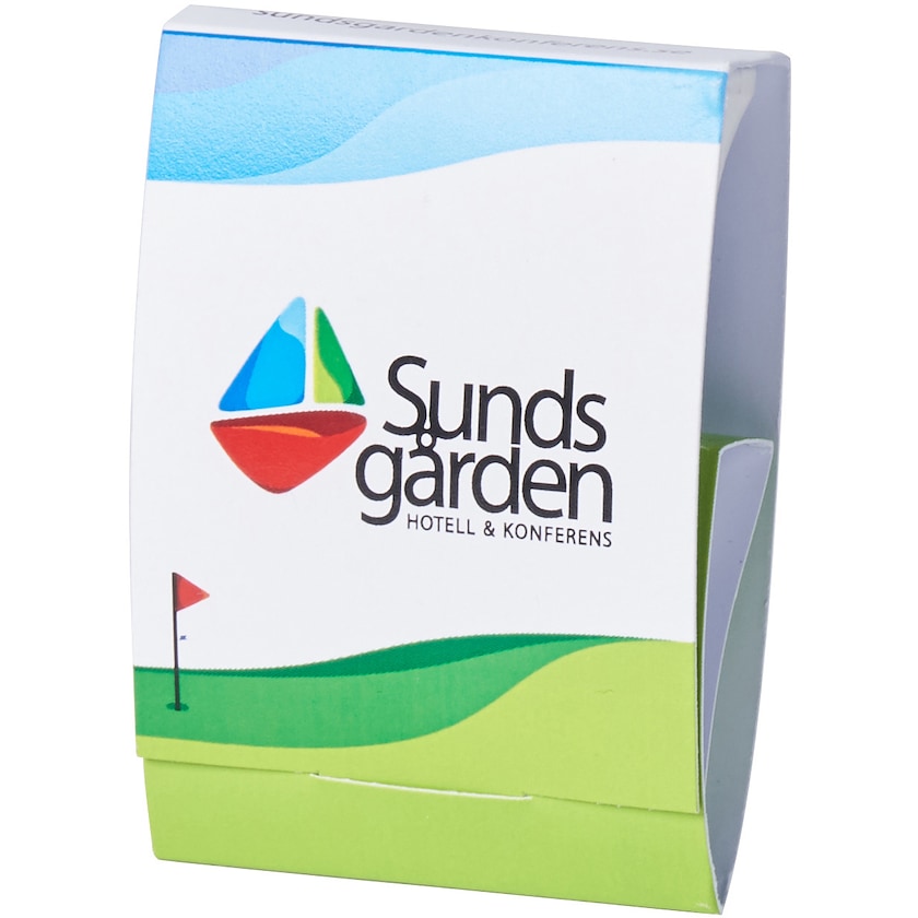 Piccola scatola di carta con quattro tee e un marcatore per palline. Scegli la lunghezza dei tee tra 55, 70 o 82 mm e poi il colore. Il prezzo include la stampa digitale sull'esterno della scatola di carta e sul marcatore per palline così come la stampa in monocromia sui tee. Il marcatore per palline ha una superficie personalizzabile di Ø 25 mm mentre i tee di 25 x 4 mm (tee da 55 mm), 34 x 4 mm (tee da 70 mm) e 42 x 4 mm (tee da 82 mm). Alternativamente la stampa può essere posizionata sulla testa del tee e in questo caso la superficie personalizzabile è di Ø 9 mm.