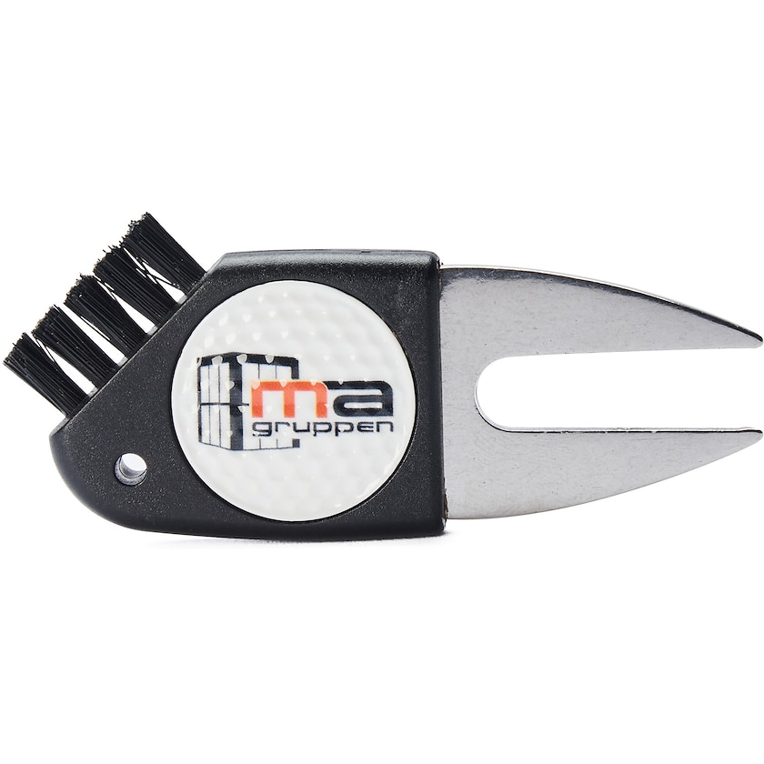 Alza pitch con marcatore e spazzola per mazza da golf. La personalizzazione viene realizzata con stampa digitale sul marcatore. Quest'ultimo ha una bella superficie coperta di fossette.
