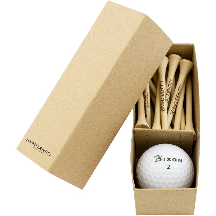 Set con pallina da golf e tee in legno. La pallina da golf è di tipo Dixon Earth. Sono inclusi 20 tee. Il prezzo di stampa si riferisce alla stampa sulla pallina da golf, sui tee e sulla scatola di carta. È solo possibile la stampa a un colore.