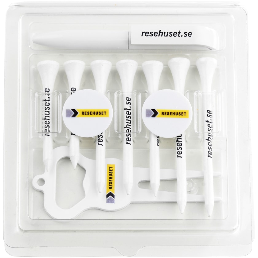 Set con accessori da golf in una bella confezione regalo. Il set contiene sette tee in legno di tre lunghezze diverse, due marcatori, un alza pitch e una penna per punteggio. La stampa viene realizzata su tutti gli accessori da golf.