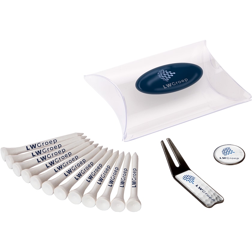 Set con tee da golf, alza pitch e marcatore. Il logo viene personalizzato con stampa digitale sulla confezione, sui marcatori, sull'alza pitch e sui dodici tee da golf. I tee da golf misurano 70 mm di lunghezza e sono fatti in bambù.