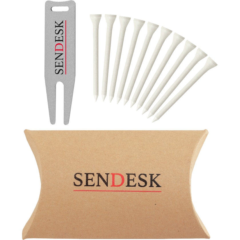 Set da golf con 10 tee e un alza pitch in una scatola di carta. Puoi scegliere tu stesso il colore dei tee e dell'alza pitch (vedi le foto dettagliate per i colori). La stampa viene realizzata sull'alza pitch e sulla confezione di carta.
