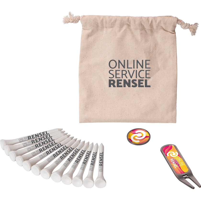 Set con tee da golf, alza pitch a marcatori in custodia di cotone. I tee da golf misurano 70 mm e sono realizzati in legno. La custodia è in cotone biologico. Il prezzo di stampa si riferisce alla stampa a un colore sui tee da golf e alla stampa digitale sulla custodia, sull'alza pitch e sul marcatore.