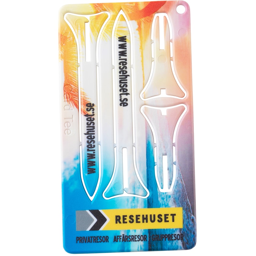 Cartolina di plastica con due tee da montare. Ecco l'invito perfetto per il prossimo evento per appassionati di golf! Sarà sufficiente esercitare pressione sulle parti sagomate per montare due tee da golf da 70 mm. Il prezzo di stampa si riferisce alla stampa su uno dei due lati.