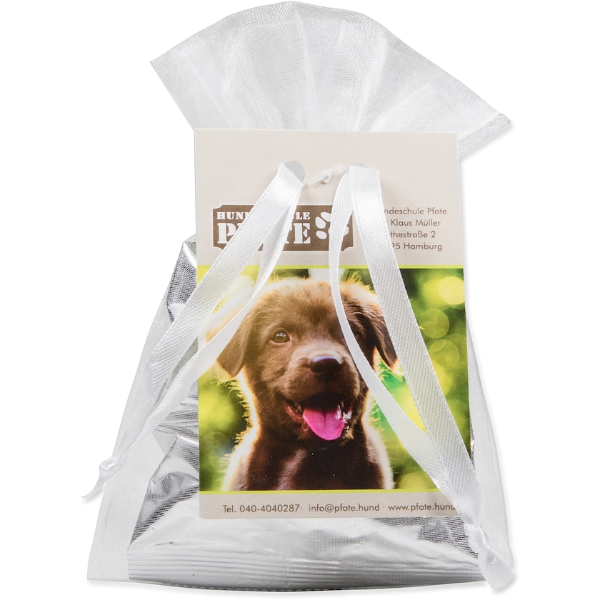 Snack per cani in busta di organza. Il nastrino che chiude la busta viene interamente personalizzato secondo i vostri desideri. Gli snack per cani sono un prodotto Happy Dog adatto ai cani di almeno 4 mesi di età.
