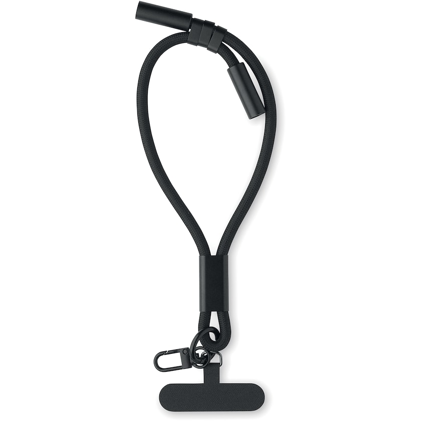 Cavo di ricarica e trasmissione dei dati a forma di supporto per cellulare con laccetto da polso. I cavi sono di tipo C a tipo C e sono realizzati in rPET.