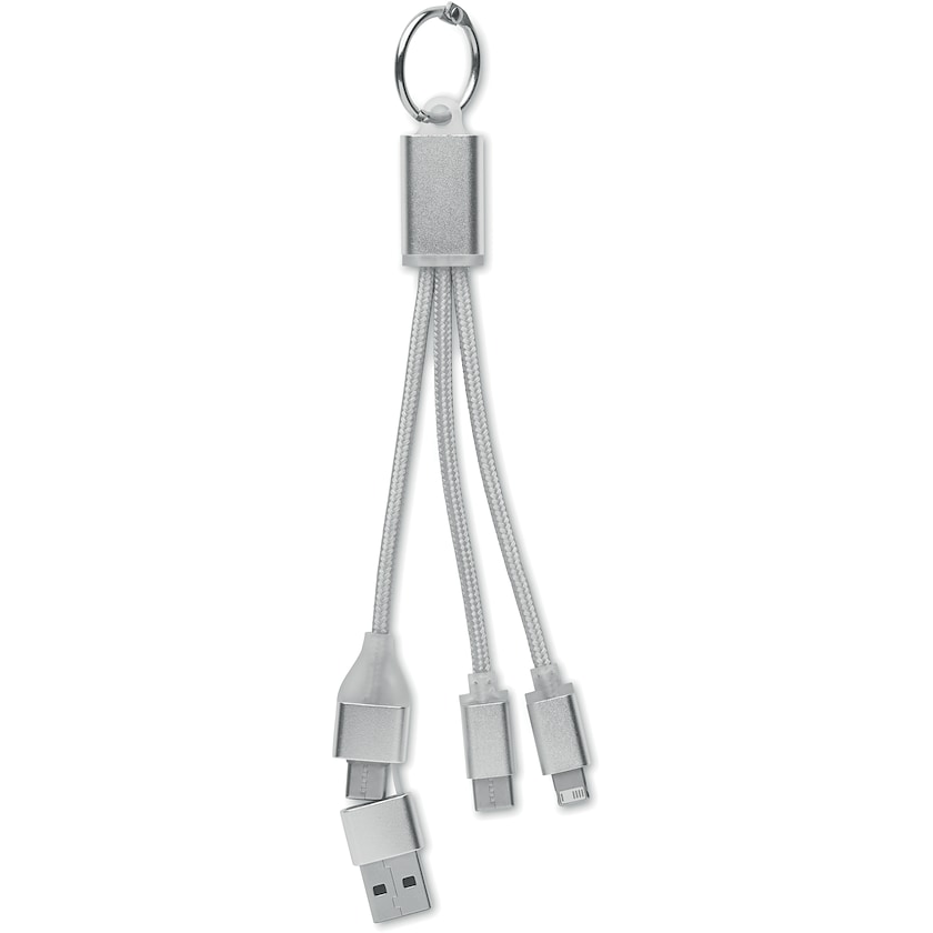 Cavo di ricarica con portachiavi e tre uscite. Le uscito sono di tipo 2 in 1 C & A, micro USB e tipo C. Scegli tra stampa e incisione a laser.