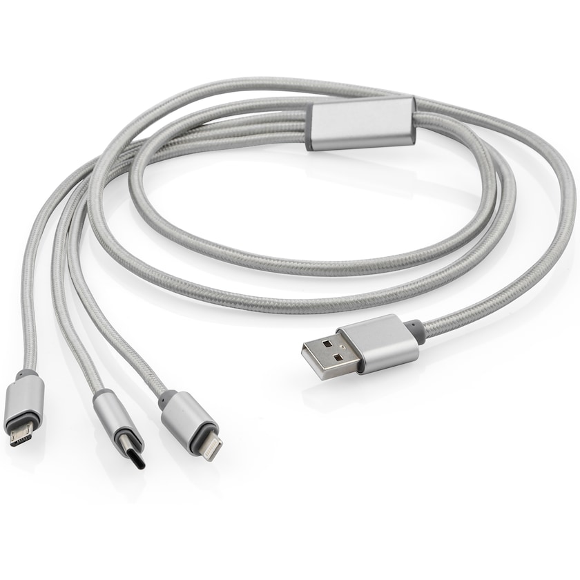 Cavo per cellulare con tre connettori. Mega ha un'uscita di tipo C, un'uscita micro-USB e un'uscita per iPhone5 o modelli più recenti. Il logo viene inciso a laser.