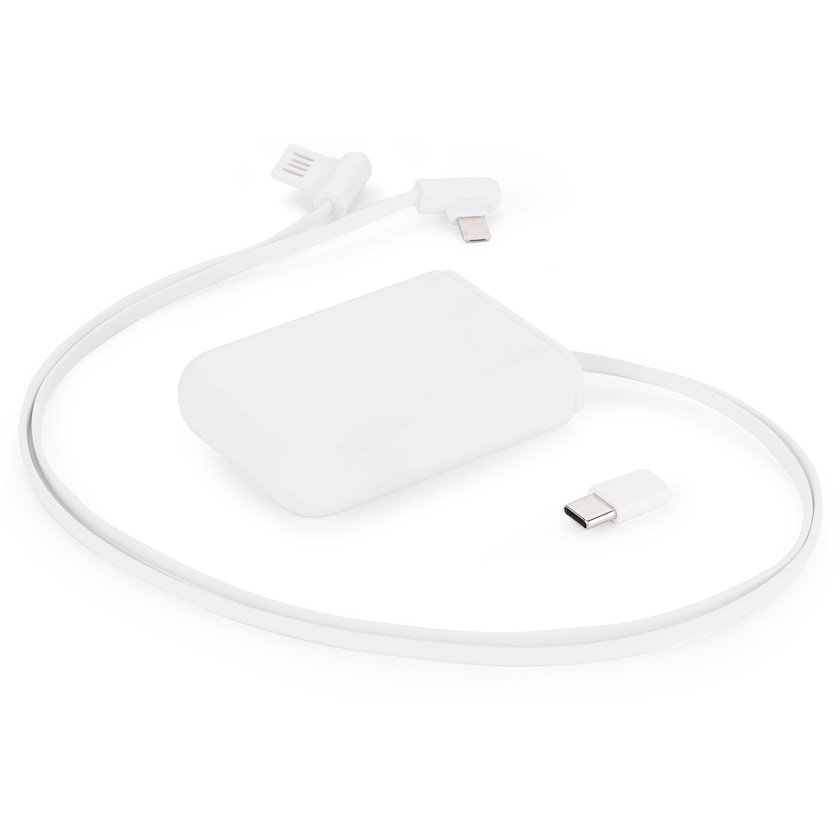 Pratico cavo di alimentazione in una pratica custodia. Contiene un cavo USB con contatti micro-USB, lightning e di tipo C. I cavi si ritirano automaticamente nella custodia quando non sono in uso.