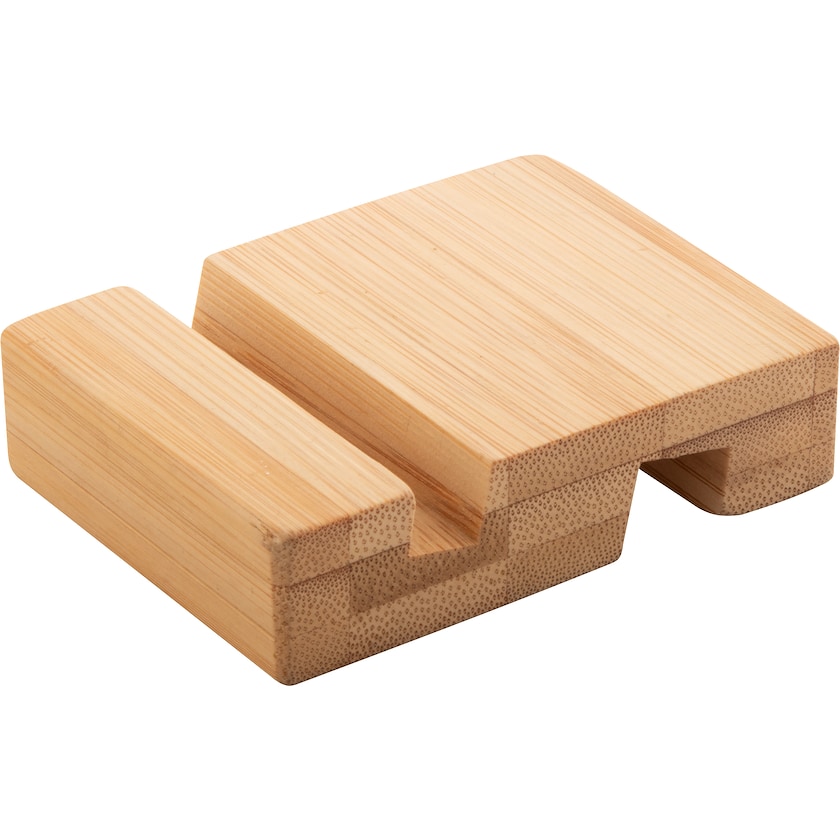 Supporto per cellulare che può sorreggere un cellulare o un tablet. La personalizzazione può essere realizzata con stampa in massimo due colori o con incisione a laser.