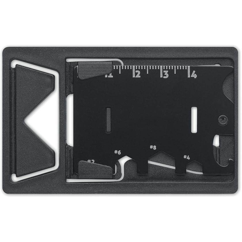 Supporto per cellulare in acciaio inox con sei funzioni extra. Le funzioni extra sono righello, chiave esagonale, apribottiglie e cacciaviti. Consegnato in una custodia di simil pelle.