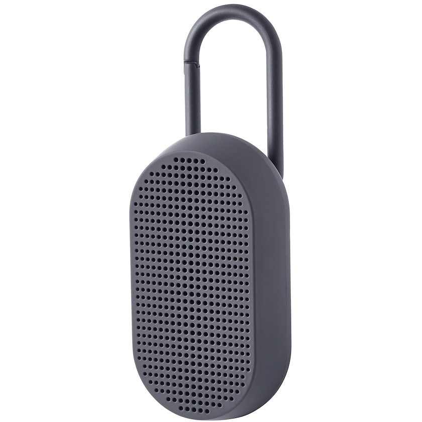 Altoparlante compatto con moschettone integrato. Utilizza bluetooth 4.2. Può essere utilizzato all'aperto grazie all'impermeabilità IPX4. Può essere collegato a un altro dispositivo grazie alla tecnologia TWS. Si ricarica attraverso una porta USB-C in due ore e ha autonomia d'uso di 5 ore. Cavo di ricarica incluso.