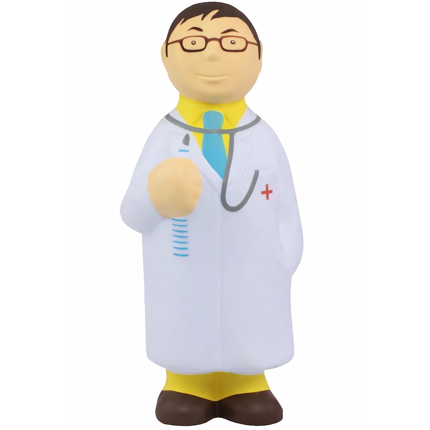Pallina antistress a forma di dottore con camice. Fatti aiutare da un medico per liberarti dallo stress! La stampa mantiene un'altissima qualità.