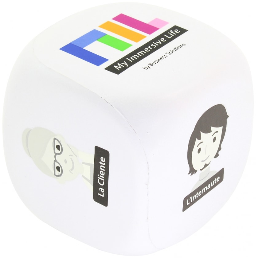 Pallina antistress a forma di dado senza puntini. Perfetto per chi vuole stampare su diversi lati.