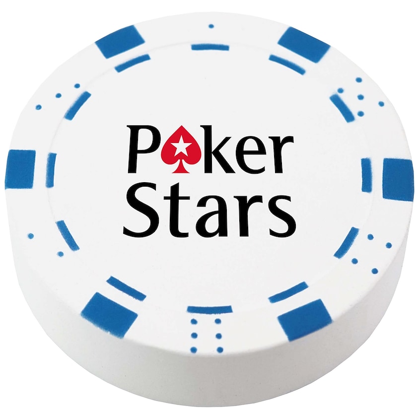Pallina antistress a forma di fiche da poker. Il disegno blu sul bordo è stampato su tutte le palline antistress. Un divertente prodotto promozionale per casinò!