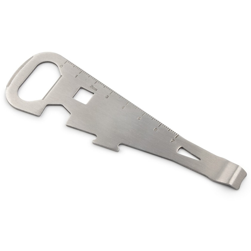 Apribottiglie con sette funzioni in totale. Funge da apribottiglie, apriscatole, righello, piede di porco e due tipi di chiave inglese.