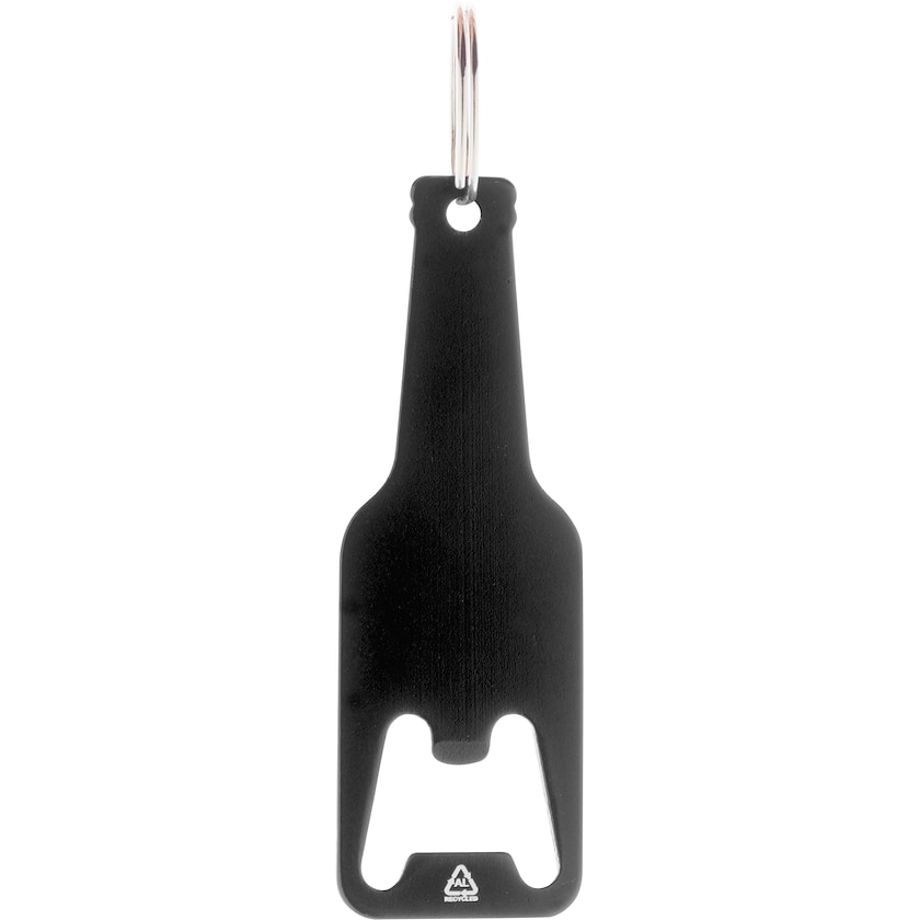 Apribottiglie a forma di bottiglia in alluminio riciclato. Perfetto per portachiavi. Il logo viene stampato o inciso a laser.