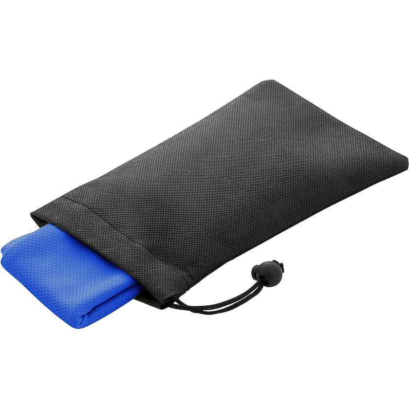 Asciugamano sportivo ecologico con custodia nera. L'asciugamano resta fresco anche quando è bagnato. È realizzato in PET, ossia in bottiglie di PET riciclate. La custodia è in tessuto non tessuto. La superficie di stampa sull'asciugamano è di ben 100 x 60 mm, mentre quella sulla custodia è di 140 x 80 mm.