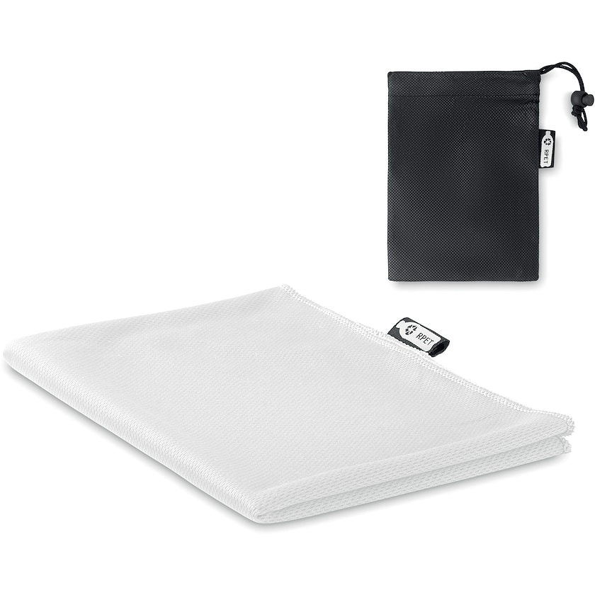 Asciugamano sportivo ecologico personalizzato. Questo asciugamano assorbe l'acqua meglio di un normale asciugamano. Sarà perfetto per la palestra. L'asciugamano e la custodia sono realizzati in rPET, ossia in bottiglie di PET riciclate.