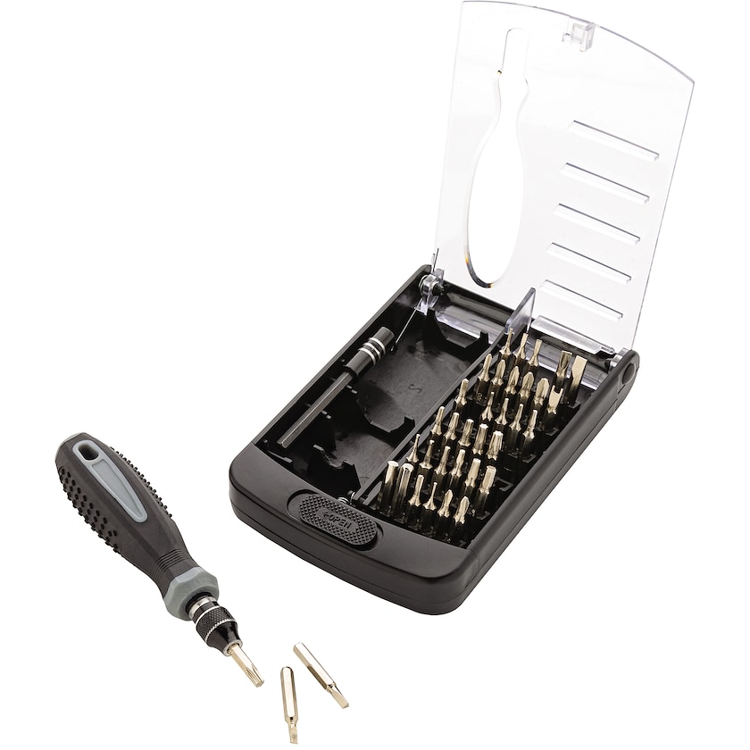 Set di punte per cacciavite con 38 pezzi. L'ideale per i tuttofare! Viene consegnato in un'elegante confezione regalo. Le punte di cacciavite sono realizzate in acciaio al carbonio, che le rende molto resistenti. È solo possibile la stampa a un colore.
