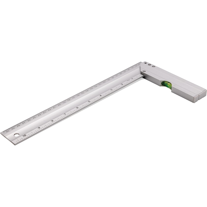 Squadra con livella a bolla d'aria. Beckemeyer è realizzata in allumino e ha una precisione di 0,5 mm. Un lato misura 30 cm, l'altro 10 pollici. Destinato a un uso professionale.