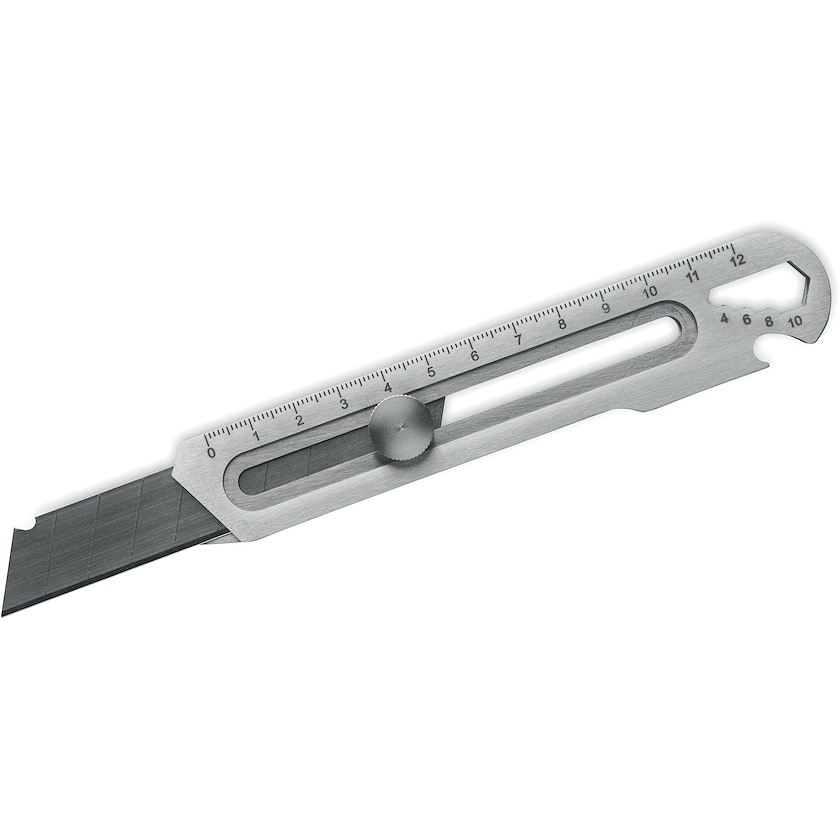 Taglierino in acciaio inox con lama in acciaio al carbonio. Il taglierino non ha soltanto funzione di coltello ma anche di apribottiglie, chiave inglese e righello.