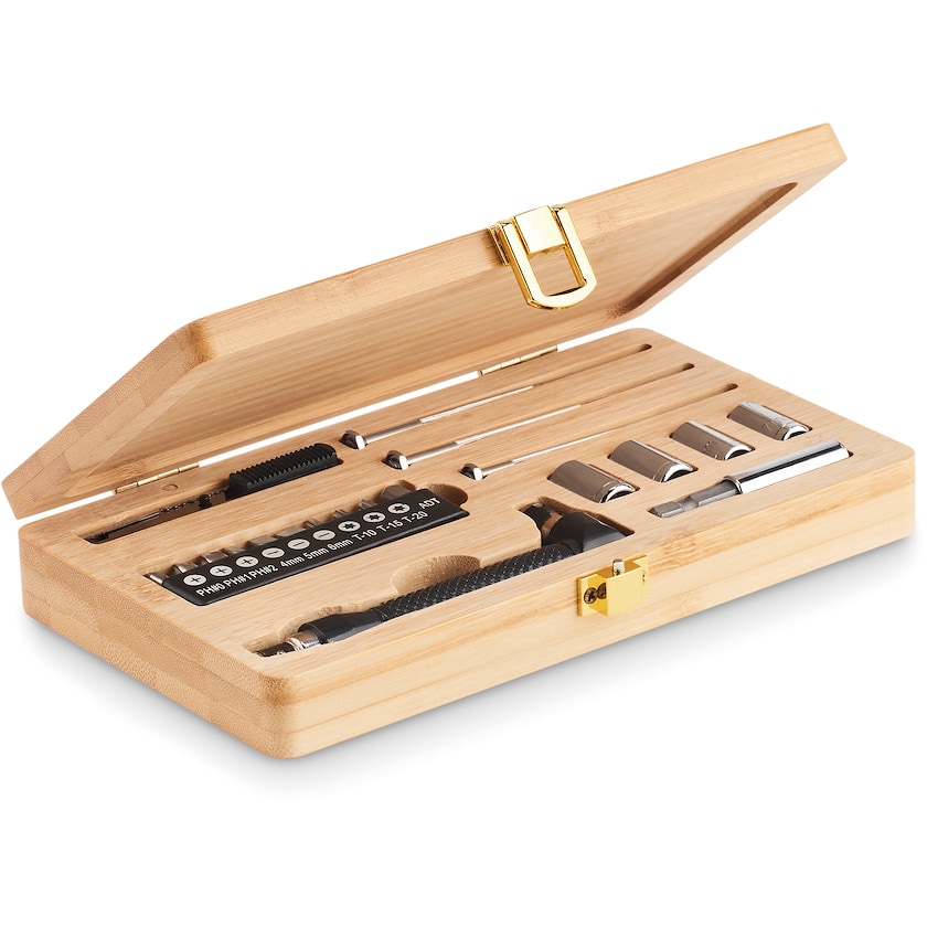 Pregiata cassetta degli attrezzi. Questa cassetta degli attrezzi contiene tutto il necessario per le riparazioni casalinghe. La cassetta in sé è realizzata in vero bambù.
