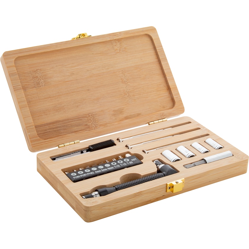 Pregiata cassetta degli attrezzi con custodia in bambù. Il regalo perfetto per chi ha appena cambiato casa! La stampa può essere realizzata in due colori.