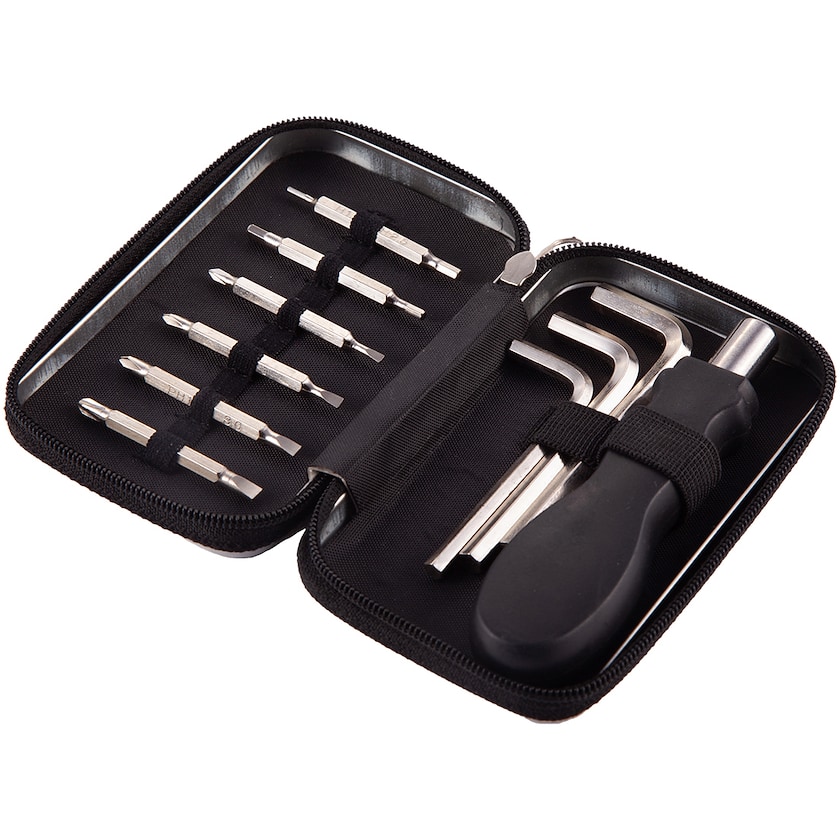 Scatola degli attrezzi contenente 10 pezzi. Cassetta degli attrezzi con cerniera lampo. Il logo viene inciso a laser.