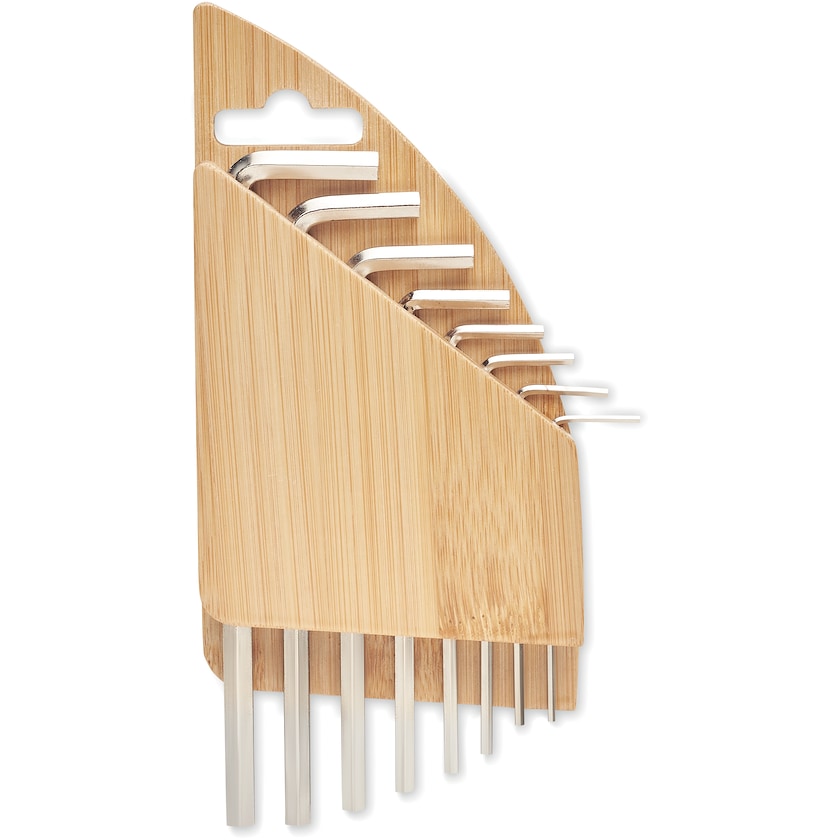 Set di 8 chiavi a brugola. Il set viene consegnato all'interno di una custodia in bambù. Il logo può essere stampato oppure inciso a laser. Il set perfetto per ogni casa!