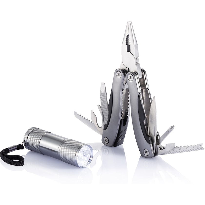 Pratico set composto dall'attrezzo multiuso Baumgarten ed una torcia. L'attrezzo multiuso ha 14 funzioni e la torcia ha 9 lampadine LED bianche. Il set è confezionato in scatola regalo nera. Il prezzo di stampa (o incisione laser) prevede la stampa solo su uno dei due articoli.