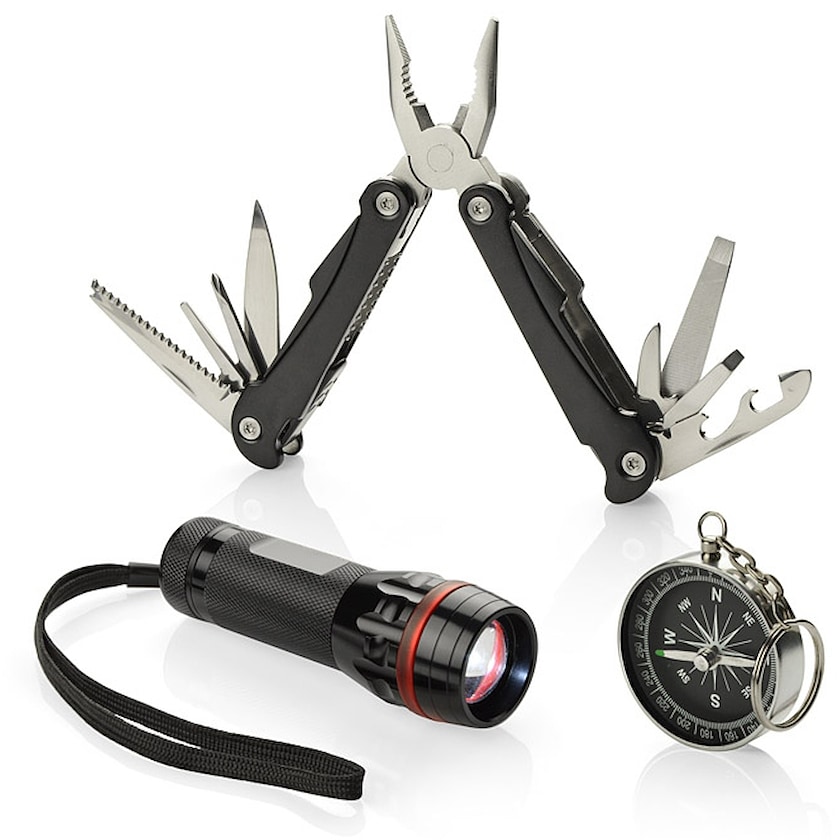 Set regalo con attrezzo multiuso, torcia e bussola. Esclusivo set da regalo con torcia e attrezzo multiuso. La torcia ha un diodo luminoso potente, luce regolabile con funzione zoom e tre tipi di luce diversi: forte, debole e ad intermittenza. La torcia, l'attrezzo e la bussola sono in metallo e sono forniti confezionati in elegante scatola regalo nera. Marcatura con incisione laser con dimensioni max 80 x 20 mm per la torcia, 60 x 7 mm per l'attrezzo multifunzione e 30 x 30 mm per la bussola.
