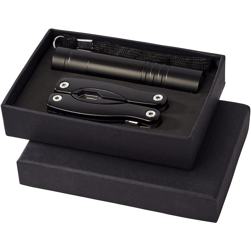 Set con attrezzo multiuso ed una torcia LED. L'attrezzo multiuso ha 11 funzioni. Fornito in una confezione regalo nera. Le batterie sono incluse. Il prezzo di stampa si riferisce alla personalizzazione di uno dei due prodotti.