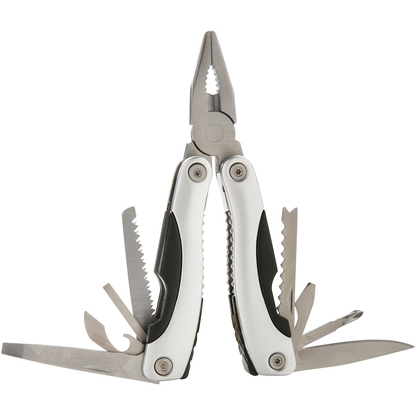 Attrezzo multiuso in alluminio con 14 funzioni. Consegnato in una pratica custodia.