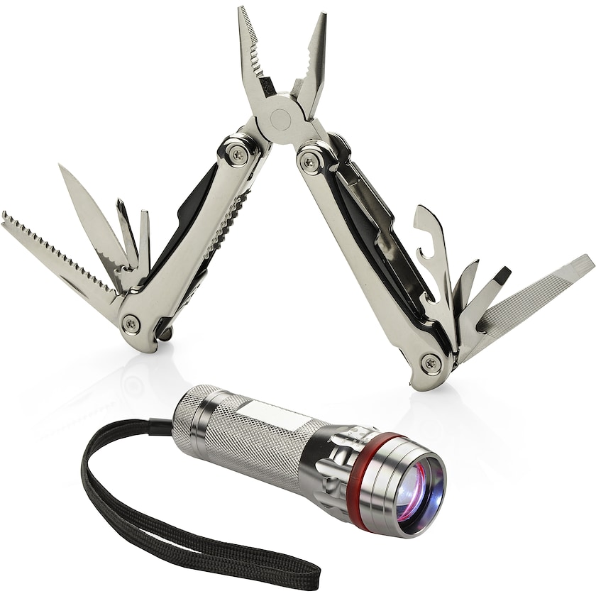 Esclusivo set regalo con torcia ed attrezzo multiuso. La torcia ha un diodo luminoso potente, luce regolabile con funzione zoom e tre tipi di luce diversi: forte, debole e ad intermittenza. La torcia e l'attrezzo sono in metallo e sono forniti confezionati in elegante scatola regalo nera. Torcia personalizzabile con incisione laser di dimensioni max 80 x 20 mm. Attrezzo multiuso personalizzabile con incisione laser di dimensioni max 60 x 7 mm.