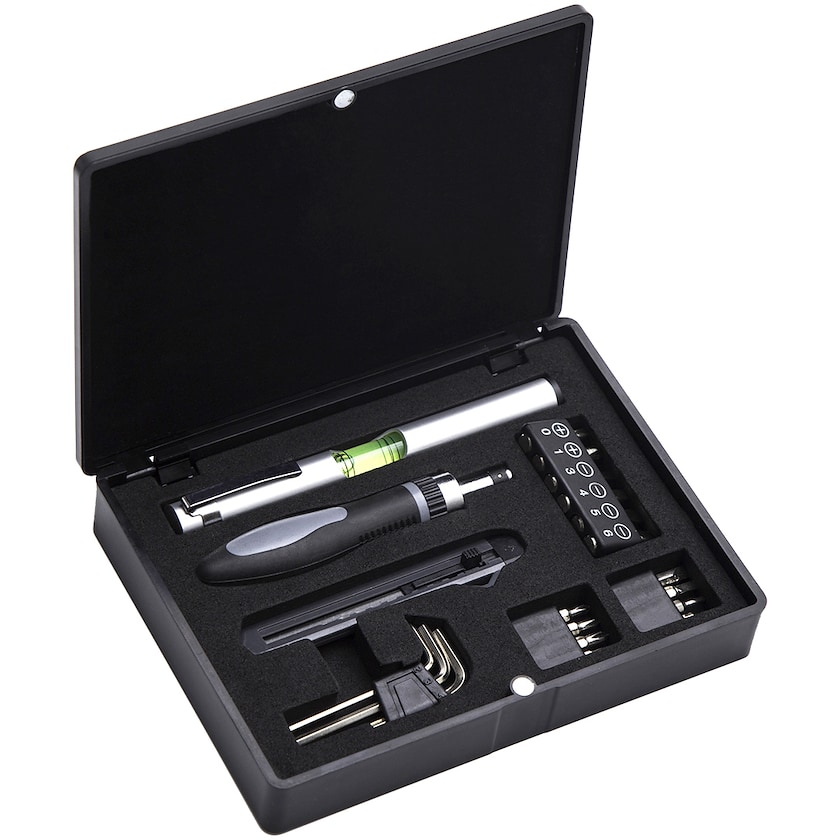 Set di attrezzi che contiene gli strumenti più importanti per la casa. Un prodotto personalizzato perfetto per le aziende del settore immobiliare. La personalizzazione è eseguita con incisione laser.