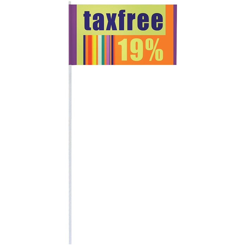Bandierina di carta con stampa pubblicitaria. In carta offset laminata opaco 100 g/ m² incollata su un bastoncino lungo circa 40 cm. Il bastoncino è composto al 70% da materiale riciclato. La bandierina può essere stampata su entrambi i lati, anche con motivi diversi. In pacchettini da 50 bandierine in confezione da 1000 pezzi.