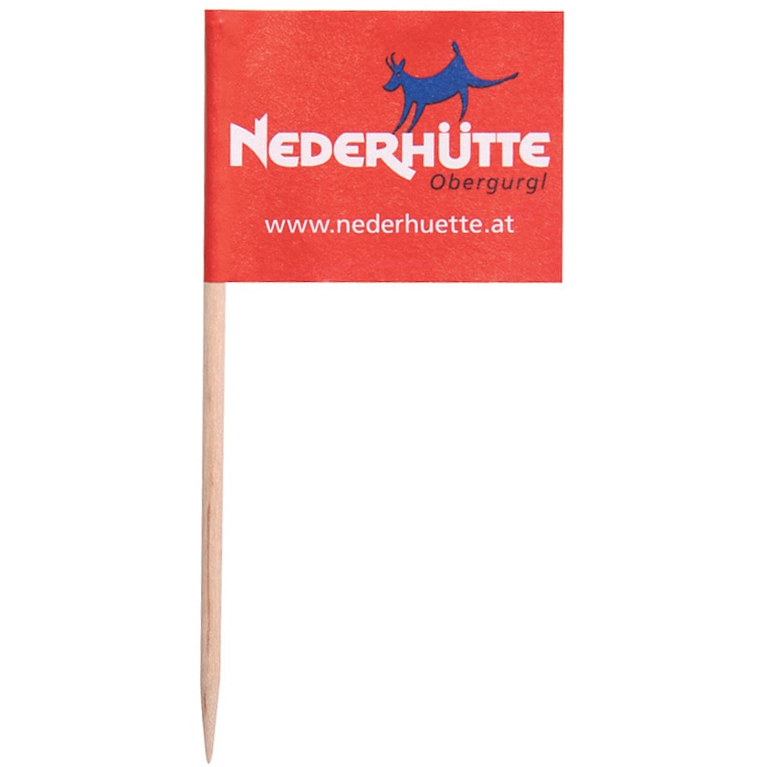 Bandierine da cocktail personalizzate con logo. Queste bandierine sono realizzate in carta offset senza legno e sono incollate ad un bastoncino di legno lungo circa 80 mm. Le bandierine possono essere stampate su entrambi i lati, anche con motivi diversi. Ordini: multipli di 1000 pezzi.