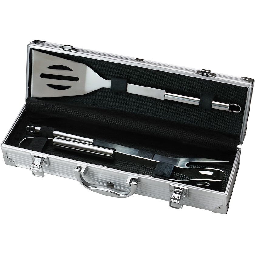 Set da barbecue con 3 accessori, in valigetta di metallo. Con pinze, forchettone e spatola. Personalizzabile con incisione laser sulla placca in metallo localizzata sulla valigetta.