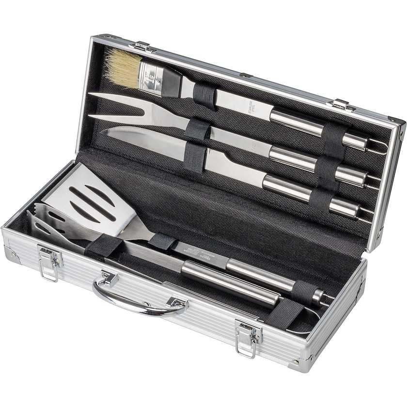 Set con 5 utensili per il barbecue in una scatola elegante. La personalizzazione viene eseguita con incisione laser su una piastra metallica sulla custodia. Un bel set per le serate da barbecue in estate!
