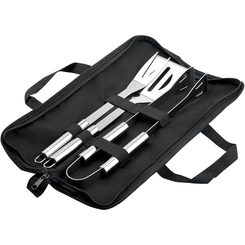 Set da barbecue di 3 pezzi, in pratica custodia. Con moschettone, spatola e pinze. La custodia è personalizzabile con la stampa del tuo logo.