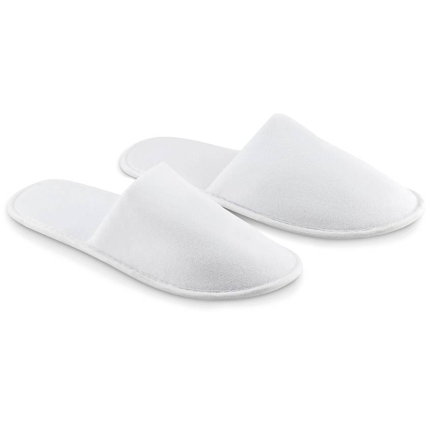 Un paio di ciabattine. Queste ciabattine sono di misura 44-45 e vengono consegnate in una confezione regalo. Perfette per alberghi e ostelli. La stampa viene realizzata sulla confezione regalo.
