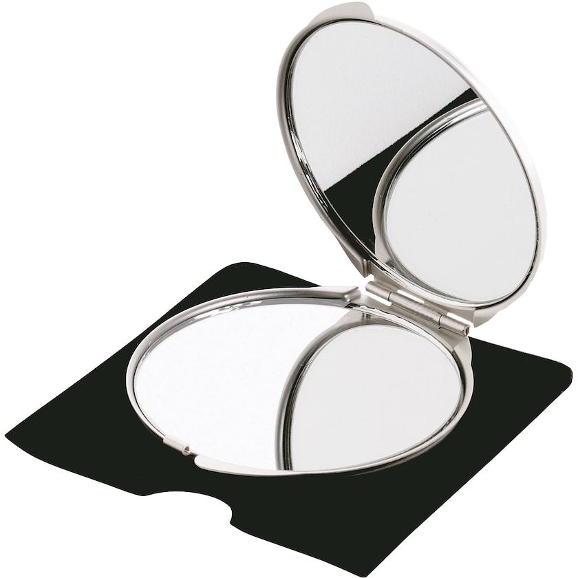 Specchietto per il trucco con specchio normale e da ingrandimento. Il modello Angelina è realizzato in alluminio e viene fornito in una custodia di velluto nera. Il logo viene applicato con incisione laser.