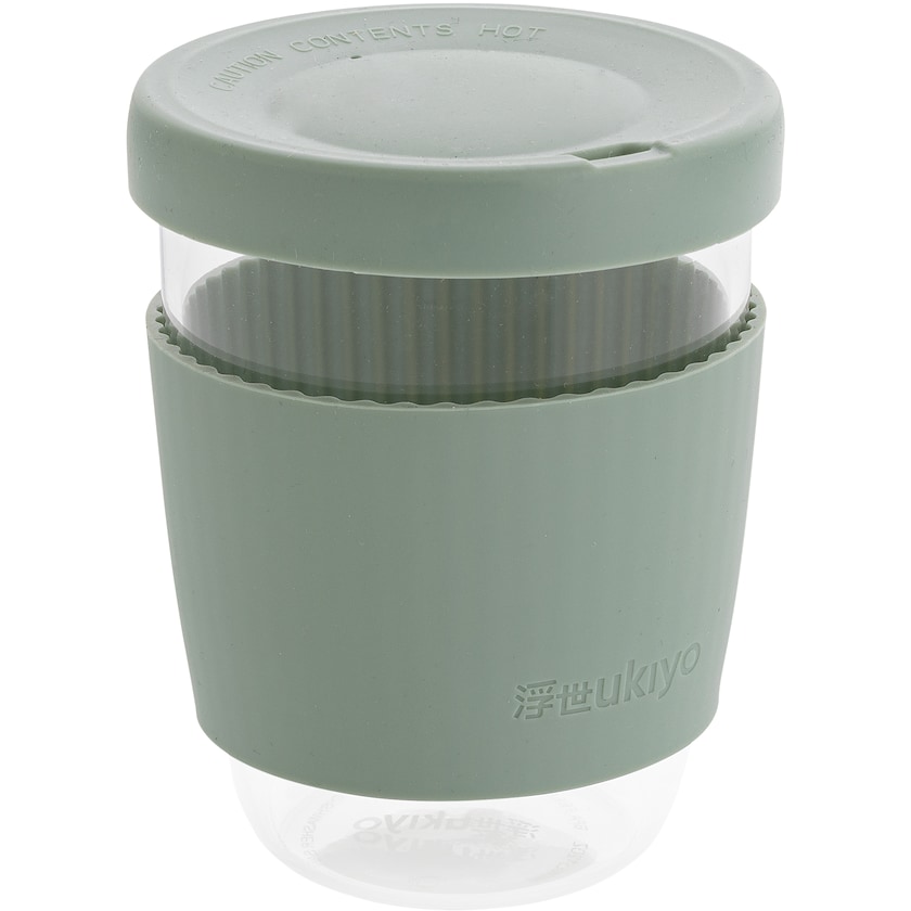 Bicchiere take-away in vetro di marca Ukiyo. L'impugnatura e il tappo sono realizzati in silicone. Il tappo ha una piccola apertura che permette al vapore di uscire. Il vetro è di tipo borosilicato, cioè molto resistente e refrattario.