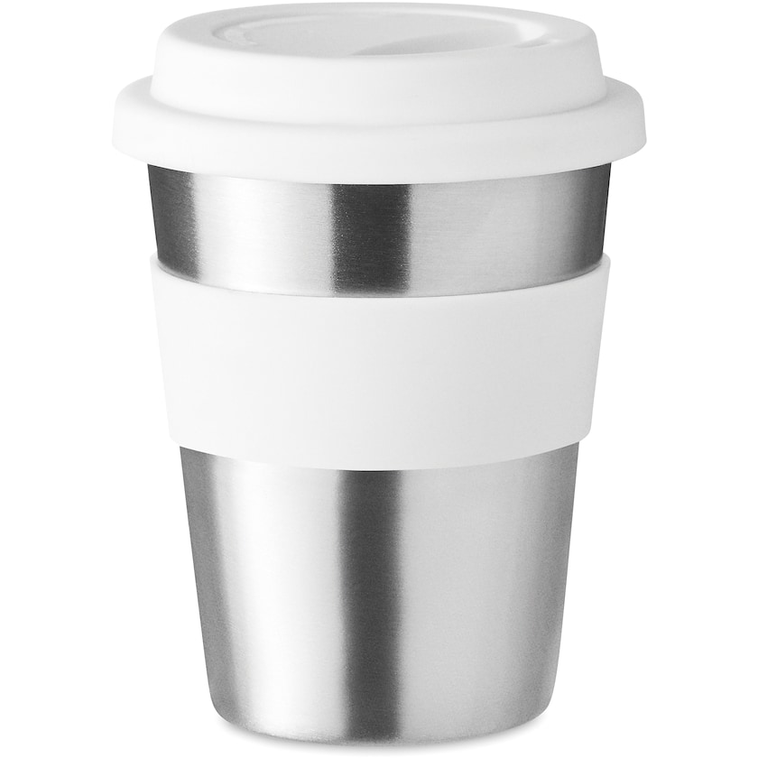 Bicchiere take away in acciaio inox con tappo e impugnatura in silicone. Ha una capienza di 35 cl, l'ideale da portare con sé. Se puoi limitare la tua stampa a un solo colore allora la superficie di stampa è di ben 220 x 20 mm, che è molto più ampia della media.