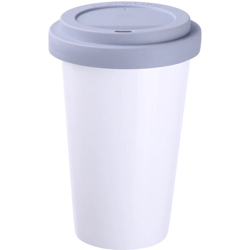 Tazza take away in porcellana con tappo in gomma. La tazza ha pareti doppie grazie alle quali mantiene le bevande calde alla loro temperatura più a lungo.