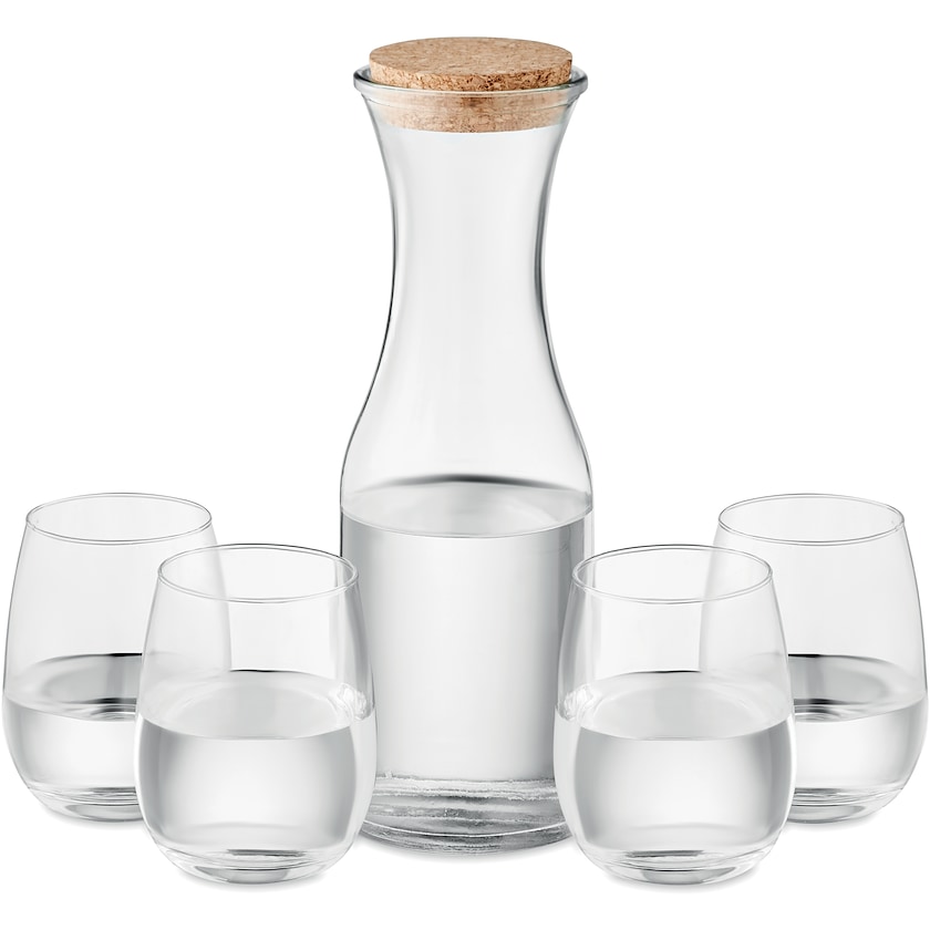 Set di quattro bicchieri da acqua e una caraffa. Il vetro è realizzato in vetro riciclato, mentre il tappo è in sughero. La caraffa ha una capienza di 100 cl e ogni bicchiere ha una capienza di 42 cl. Il prezzo di stampa si riferisce alla stampa su uno dei bicchieri o sulla caraffa. La superficie di stampa sui bicchieri è di 30 x 30 mm, mentre sulla caraffa di 40 x 40 mm.